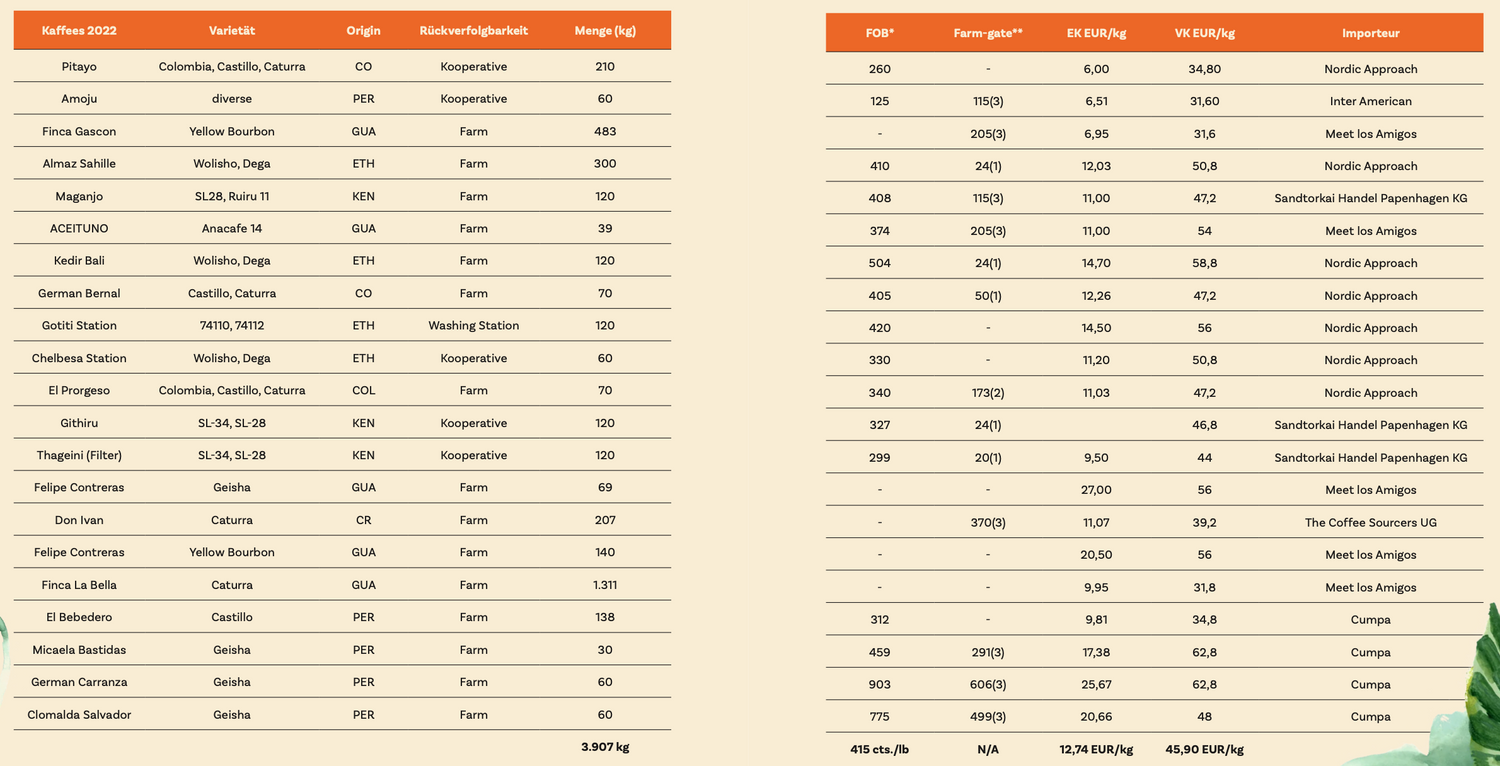 6. Wir pflegen und veröffentlichen eine fortlaufende Liste des Rohkaffee Einkaufs, um die Entwicklung unseres Handelns langfristig im Blick zu behalten.